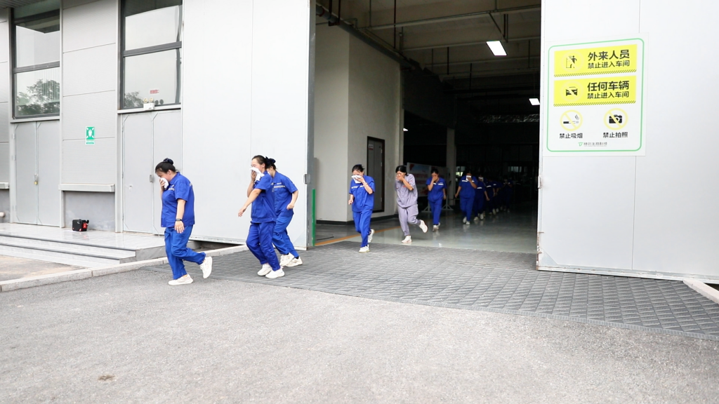 演練模擬公司發(fā)生火災(zāi)場景。隨著警報聲響起,員工們迅速反應(yīng),按照預(yù)定疏散路線,用濕毛巾捂住口鼻,彎腰低姿,快速、有序地從各個樓層撤離至安全區(qū)域。整個疏散過程緊張而不慌亂,充分展現(xiàn)了員工良好的應(yīng)急反應(yīng)能力。